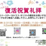 2024年3月3日 / 最終更新日時 : 2024年3月3日 saitama復活祝賀礼拝 日時:2024年3月31日 終日 場所:さいたま感謝キリスト教会, 埼玉県さいたま市大宮区三橋3-18-2イースター(復活祭)はキリストが復活したことを記念する日です。 もちろんクリスチャンでなくても、どなたでも参加可能です。 ぜひお気軽にお越しください。お待ちしております! ※こちらも合わせてご参考下さい。 去年の復活祝賀礼拝の様子 よくある質問 アクセス