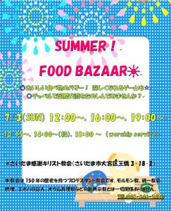 2016年7月10日 / 最終更新日時 : 2016年8月1日 saitama イベント 7/3 フードバザーTweet こんにちは! 最近はめっきり暑くなってきましたね^^;7/3日の礼拝では、フードバザーがありました。 このように、様々なメニューを用意されていて、美味しくいただきました。 7月誕生日になる婦人会の方々。おめでとうございます!! また、屋上でゲームなどをして遊んだりもしました。 子供たちは特に楽しそうでした^^ 今回のフードバザーの利益金は、第24回 KOSTA-JAPANのために用いられます。 協力していただいた方々、ありがとうございました。
